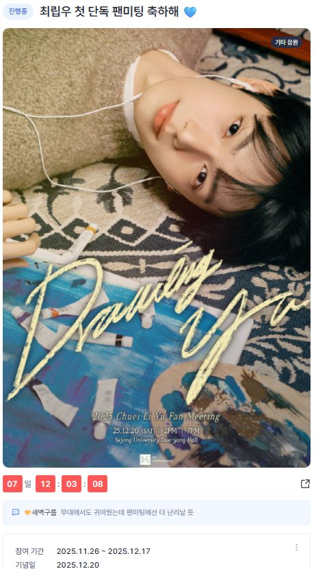 참여 기간은 지난 11월 26일부터 오는 17일까지이며 기념일은 20일이다. 팬들은 댓글과 메시지를 통해 팬미팅을 축하하고 기대감을 표현하며 참여를 이어가고 있다.