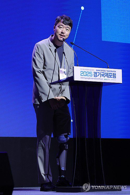 (고양=연합뉴스) 임병식 기자 = 10일 경기도 고양시 킨텍스에서 열린 2025 경기국제포럼에서 박찬종 전북장애인사이클연맹 선수가 축사하고 있다.