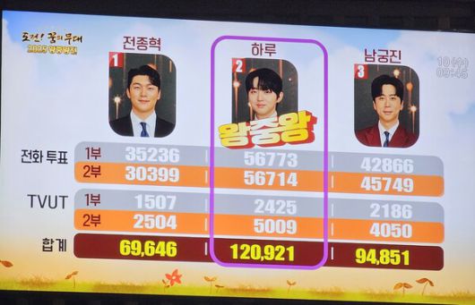 10일 방송된 '도전 꿈의 무대 왕중왕전'은 지난주 준결승전 우승자인 하루, 남궁진, 전종혁의 삼파전이 관전 포인트였다. 이미 대형 오디션 출신으로 많은 팬덤을 보유한 남궁진, 전종혁과 달리 하루는 오직 폭발적인 가창력과 진정성 넘치는 표현력으로 정상에 올랐다.