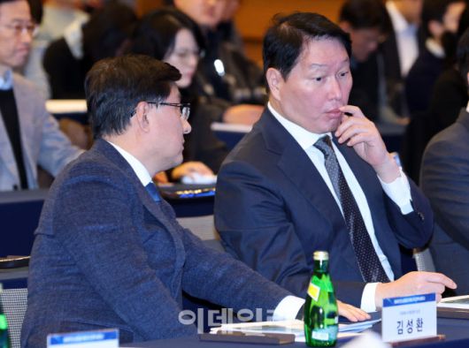 [이데일리 방인권 기자] 최태원 대한상의 회장(오른쪽)과 김성환 기후에너지환경부 장관이 10일 서울 중구 대한상공회의소에서 대한상의-서울대학교 공동 주쵷로 열린 '제8회 탄소중립과 에너지 정책 세미나'에서 이야기를 나누고 있다.
