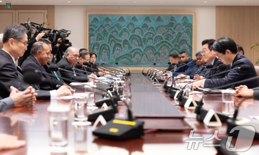 (서울=뉴스1) 허경 기자 = 이재명 대통령이 10일 서울 용산 대통령실 청사에서 태평양도서국 외교장관 단체를 접견하고 있다. (대통령실 제공. 재판매 및 DB 금지) 2025.12.10/뉴스1neohk@news1.krCopyright ⓒ 뉴스1. All rights reserved. 무단 전재 및 재배포, AI학습 이용 금지.