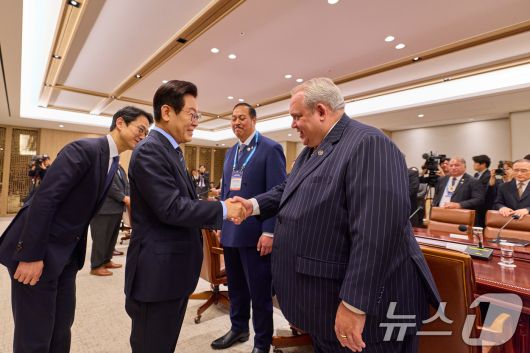 (서울=뉴스1) 허경 기자 = 이재명 대통령이 10일 서울 용산 대통령실 청사에서 열린 태평양도서국 외교장관 단체 접견에서 참석자들과 인사하고 있다. (대통령실 제공. 재판매 및 DB 금지) 2025.12.10/뉴스1
