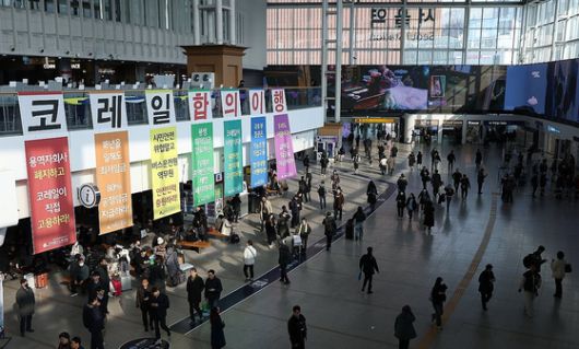 서울역에 '코레일 합의이행'라고 적힌 민주노총 전국철도노동조합 현수막. 〈사진=연합뉴스〉 |