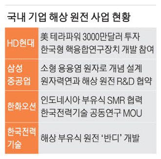국내에서도 여러 연구기관과 기업들이 해상 원전을 개발 중이다. 한국원자력연구원은 직접 개발한 SMR 기술인 'SMART'를 기반으로 선박해양플랜트연구소와 함께 해상 원전을 개발하고 있다. 한국전력기술은 '반디'라는 이름의 해상 원전을 자체 개발 중이며 이미 상당 부분 진전을 이뤄냈다. 해양 플랜트 부문에서 세계적 경쟁력을 갖추고 있는 삼성중공업이나 한화오션 등도 해상 원전을 개발하고 있다. 국내에서 활용하기보다 수출하는 용도다. 우리나라는 국토가 작아 해상 원전이 필요할 정도의 오지가 없다. 그 대신 해상 원전은 대량으로 만들어 전 세계로 수출할 수 있으니 원전업계에서 차세대 분야로 준비하는 것이다. 섬이 많은 동남아시아 도서지역 등이 주요 시장이 될 전망이다. 업계에서는 부유식 원전에서 전력과 함께 수소나 암모니아 같은 고부가가치 물질을 생산하는 비즈니스 모델을 구상하고 있다. 현재 기술로 이런 물질을 생산하려면 많은 전력이 필요하지만, 부유식 원전에서 만들어지는 전력을 활용하면 훨씬 효율적으로 경제성을 얻을 수 있다.