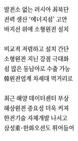최근 해상 원전이 원전업계와 조선업계의 차세대 먹거리로 떠오르고 있다. 해상 원전은 러시아 사례처럼 해상 부유식 원전과 선박 추진식 원전을 모두 아우르는 개념이다. 해상 부유식은 바지선이나 해양 플랜트에 소형 원전을 설치해 전력을 생산하고, 선박 추진식은 항공모함처럼 거대한 선박의 추진 동력을 원전에서 얻는다. 원전을 바다에 띄우는 주된 이유는 이동이 가능하기 때문이다. 러시아 페베크 사례처럼 발전소를 건설하기 어려운 오지에도 에너지를 공급하는 수단이 된다. 원전을 탑재한 바지선은 어디든 이동할 수 있기 때문에 비교적 낮은 비용으로 에너지를 공급할 수 있다. 해상 원전은 설치도 간단하다. 지상에 원전을 지으려면 온갖 인허가 절차를 거쳐야 하고, 주민들 반발도 넘어야 한다. 해상 원전은 일단 사람들의 주거 지역에서 멀리 떨어질 수 있기 때문에 주민 수용성 면에서 훨씬 유리하다. 또한 지상 원전은 토목 공사부터 시작하기 때문에 건설에 오랜 시간이 걸리지만, 해상 원전은 훨씬 이른 시간 내에 만들 수 있다.