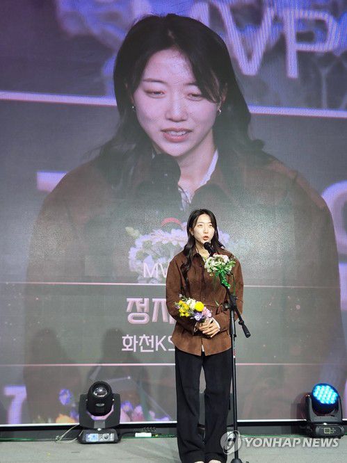 (서울=연합뉴스) 배진남 기자 = 10일 서울 송파구 서울올림픽파크텔에서 열린 2025 한국여자축구연맹 시상식에서 WK리그 최우수선수상을 받은 화천KSPO의 정지연이 발언하고 있다. 2025.12.10