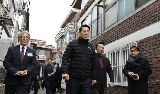 오세훈 서울시장이 10일 서울 영등포구 대림동 대림1구역 재개발 현장을 찾아 사업 추진 현황을 점검하고 있다. 연합뉴스 |