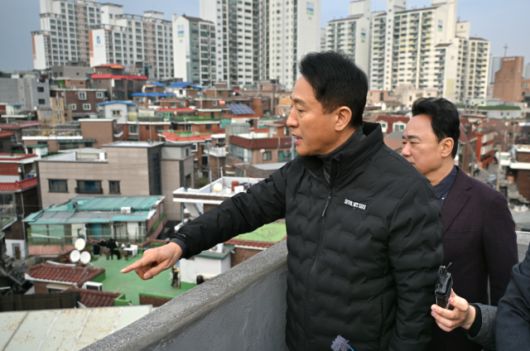 오세훈 서울시장이 10일 영등포구 대림1구역 신속통합기획 재개발 추진 현장을 바라보고 있다. [사진=연합뉴스] |