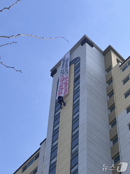 50대 남성 A 씨는 아파트 상층부 외벽에 안전띠를 착용한 채 매달려 있고 '노무비 2억3000만원(을 지급하라)' 등을 요구하는 문구가 적힌 대형 현수막이 건물 외벽을 따라 내려진 상태였다.