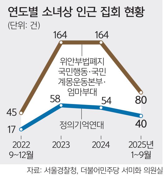 경찰 통계에 따르면 2022년 9월부터 2025년 9월까지 위안부법폐지국민행동·엄마부대·국민계몽운동본부 3개 단체가 일본대사관 인근에 신고한 집회시위는 총 453건으로 정의연 수요시위(169건)보다 2.7배 많다. 이들은 위안부 문제를 부정하는 대표적인 단체들이다. 3개 단체의 집회시위 신고 건수를 연도별로 보면 2022년 9~12월 45건, 2023년 164건, 2024년 164건, 2025년 1~9월 80건이다. 앞서 국가인권위원회는 4월 종로경찰서장에게 수요시위가 반대 집회의 방해를 받지 않도록 대책을 마련할 것을 권고했다.