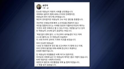 송 원내대표는 어제(10일) SNS에 극단적 진영논리에 빠져 소수야당을 존중하지 않는 이재명 정권과 더불어민주당의 폭주에 이것이 과연 국회라고 할 수 있는지 의문이 남는다면서, 인 의원의 고뇌에 공감한다고 적었습니다.