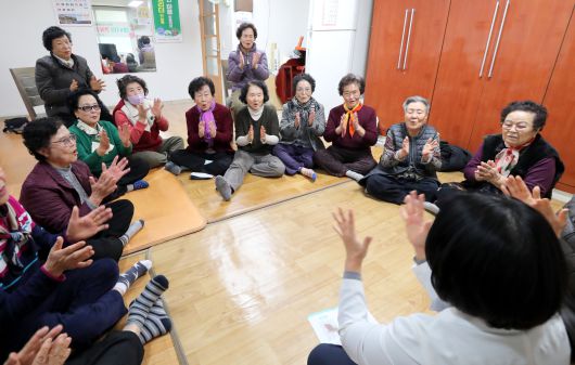 10일 오후 전남 순천의 한 경로당에 모인 노인들이 보건소 직원과 함께 ‘손 체조’를 하고 있다. 순천시는 2016년부터 ‘찾아가는 마음 건강 상담실’ 사업을 하고 있다. 보건소 직원이 경로당, 마을회관 등을 찾아가 우울증 검사와 상담 등을 한다./ 김영근 기자 |