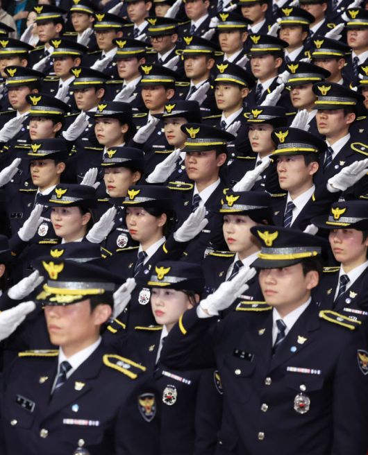 지난 3월 13일 충남 아산시 경찰대학에서 열린 2025년 신임경찰 경위·경감 임용식에서 신규 임용 경찰들이 최상목 대통령 권한대행 부총리 겸 기획재정부 장관에게 거수 경례를 하고 있다. (사진=연합뉴스) |