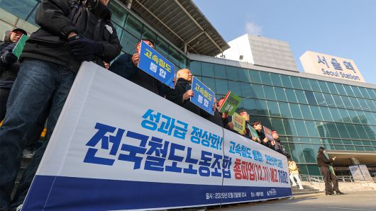 ▲ 철도노조 조합원들이 지난 2일 서울역 광장에서 총파업 예고 기자회견을 연 모습