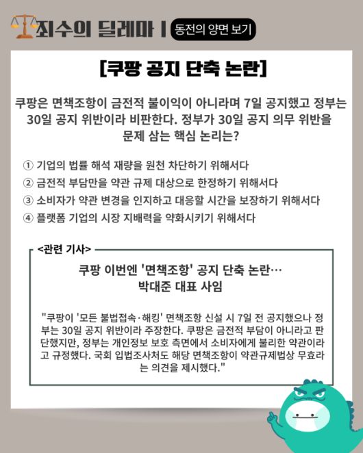 쿠팡이 지난해 11월 이용약관에 모든 불법접속·해킹 관련 면책 조항을 신설하면서 약관 변경 공지 기간을 단축 적용한 사실이 드러났다. 쿠팡은 지난해 10월 28일 이용약관 제38조(회사의 면책)를 변경한다고 공지하고 일주일 뒤인 11월 5일부터 적용했다. 쿠팡의 이용약관에는 회원에게 불리한 내용으로 변경하는 경우 30일 이전부터 공지해야 한다고 명시돼 있지만 7일 전에만 공지한 것이다. 김민석 국무총리는 쿠팡의 대규모 개인정보 유출 사태를 두고 “심각한 수준을 넘었다”며 “디지털 사회에서 국민 정보 보호는 플랫폼 기업의 가장 기본적 책무”라고 지적했다. 국회 입법조사처도 약관규제법상 쿠팡의 면책 조항이 무효에 해당한다는 의견을 제시했다. 서울경찰청 사이버수사과는 이틀 연속 압수수색을 진행했고 공정거래위원회도 조사에 착수하면서 박대준 대표는 결국 사임했다.