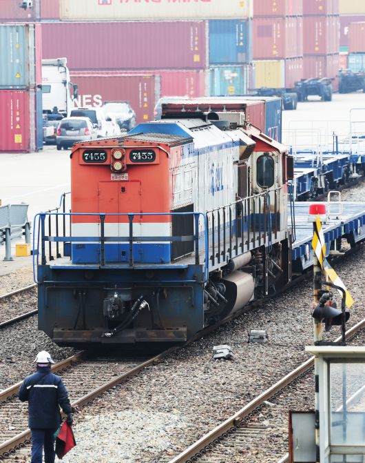 민주노총 공공운수노조 전국철도노동조합이 총파업 예고일을 하루 앞둔 지난 10일 경기도 의왕시 내륙컨테이너기지(ICD)에서 관계자들이 화물열차를 살펴보고 있다. 연합뉴스 |