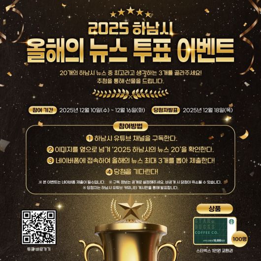 한편, ‘2025 하남시 올해의 10대 뉴스’ 선정 결과와 이벤트 당첨자 명단은 오는 18일 하남시 공식 유튜브 게시물을 통해 공개할 예정이다.