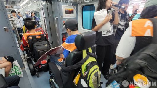 [서울=뉴스핌] 전국장애인차별철폐연대가 29일 오전 서울 지하철 1호선 노량진역에서 '64차 출근길 지하철탑니다' 탑승시위를 하고 있다. [사진=독자제공] 2025.09.29 photo@newspim.com |