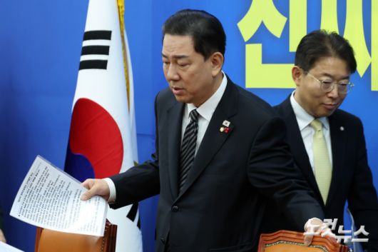 더불어민주당 김병기 원내대표가 11일 서울 여의도 국회에서 열린 정책조정회의에 참석하고 있다.