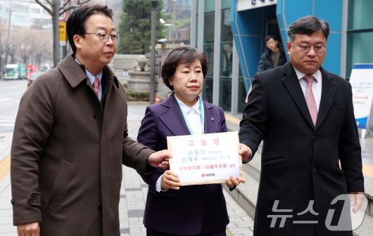 (서울=뉴스1) 김명섭 기자 = 국민의힘 조배숙 사법정의수호 및 독재저지특위 위원장, 곽규택 법률자문위원장이 11일 서울 종로구 서울지방경찰청에서 통일교 금품수수 의혹 관련 민중기 특별검사 및 수사팀을 직무유기 혐의, 전재수 해양수산부 장관 및 민주당 전현직 의원들을 정치자금법 위반·뇌물수수 혐의로 고발하고 있다. 2025.12.11/뉴스1