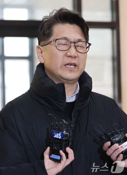 (서울=뉴스1) 이광호 기자 = 쿠팡 일용직 노동자 퇴직금 미지급 사건 수사 과정에서 외압이 있었다고 폭로한 문지석 검사가 11일 오전 서울 서초구 안권섭 특별검사팀 사무실에 참고인 신분으로 출석하며 발언하고 있다. 2025.12.11/뉴스1