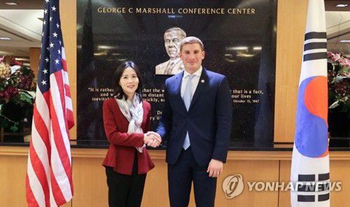 (서울=연합뉴스) 김진아 외교부 2차관(왼쪽)과 제이콥 헬버그 미국 국무부 경제 담당 차관이 10일(현지시간) 미국 워싱턴DC에서 열린 제10차 한미 고위급 경제협의회에서 악수하며 기념 촬영하고 있다. 2025.12.11 [외교부 제공. 재판매 및 DB 금지]