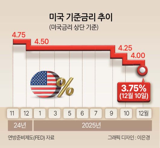 미 연준이 10일(현지시간) 연방공개시장위원회(FOMC) 정례회의에서 기준금리를 기존 3.75~4.00%에서 3.50~3.75%로 0.25%포인트 낮추면서 한국(2.50%)과 기준금리 격차(상단 기준)도 1.5%포인트에서 1.25%포인트로 좁혀졌다.