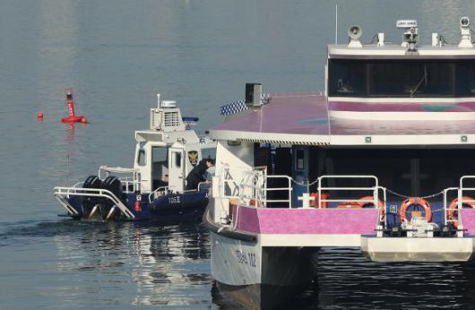 지난달 16일 서울 송파구 잠실선착장 부근 강바닥에 걸려 멈춘 한강버스와 주변 등대에서 경찰이 사고조사를 하고 있다. [사진=연합뉴스] |