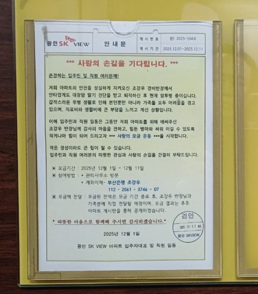 부산 수영구 광안 SK뷰 아파트 입주자대표회의 및 관리사무소는 이달 1~8일 대장암 말기 판정을 받고 퇴직한 조강우 경비반장을 돕기 위한 모금 운동을 진행했다고 최근 밝혔다.