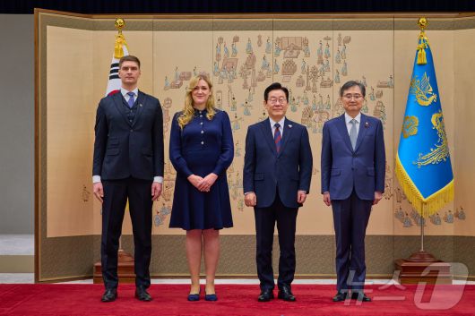 (서울=뉴스1) 이재명 기자 = 이재명 대통령이 11일 서울 용산 대통령실 청사에서 열린 주한대사 신임장 제정식에서 에바 마리 루섹 주한오스트리아 대사로부터 신임장을 받은 뒤 조현 외교부 장관과 기념촬영을 하고 있다. (대통령실 제공. 재판매 및 DB 금지) 2025.12.11/뉴스1