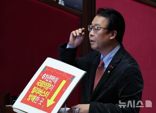 [서울=뉴시스] 김금보 기자 = 곽규택 국민의힘 의원이 11일 서울 여의도 국회에서 열린 제430회국회(임시회) 제1차 본회의에서 우원식 국회의장을 규탄하는 피켓을 두고 형사소송법 일부개정법률안(대안)에 대한 무제한토론을 하고 있다. 2025.12.11. kgb@newsis.com