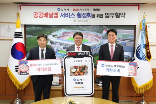 홍태용 경남 김해시장(가운데)이 11일 오전 11시 30분 시장실에서 김태한 BNK경남은행장, 김주형 ㈜먹깨비 대표와 공공배달앱 '먹깨비' 활성화를 위한 협업 협약서 작성을 알리는 안내판을 선보이고 있다. [사진=김해시] 2025.12.11 |