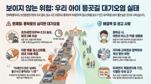 전북도 관계자는 “겉보기엔 맑아도 통학로 대기질이 어린이에게 안전하지 않을 수 있다는 점이 확인됐다”며 “민감 계층 보호를 위한 과학적 조사와 실효성 있는 정책 마련에 힘쓸 것”이라고 말했다.