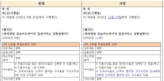 이달 10일 시행된 NH투자증권 퇴직연금 로보어드바이저 약관 개정 내용. /NH투자증권 제공 |