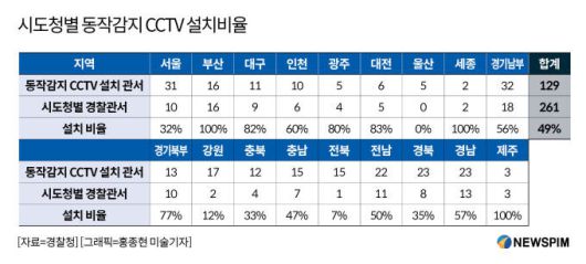 11일 뉴스핌이 채현일 더불어민주당 의원실을 통해 입수한 경찰청 자료에 따르면 전국 261개 경찰관서 중에서 동작 감지 CCTV가 설치된 관서는 129개로 설치율은 49%에 그쳤다.