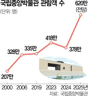 국립중앙박물관은 1945년 일제의 조선총독부박물관 건물을 인수해 개관한 이후 덕수궁 석조전, 현 국립민속박물관, 옛 중앙청, 현 국립고궁박물관 시대를 거쳐 2005년 용산으로 옮겨왔다. 다만 국립중앙박물관 관람객은 ‘용산 시대’의 본격적인 첫 해인 2006년 328만 명을 기록한 뒤 줄곧 300만 명 선에서 움직였다. 2024년 418만 명이 이전 관람객 최대치다.