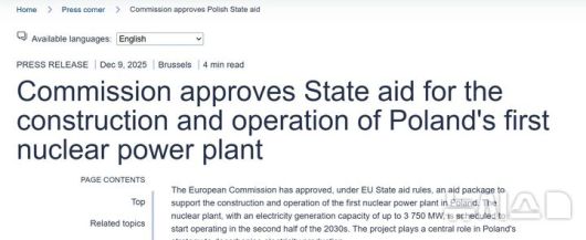 [서울=뉴시스]유럽연합(EU) 집행위원회가 폴란드 첫 원자력 발전소 건설 및 운영을 위한 지원 패키지를 승인했다고 11일(현지시간) 유로뉴스가 보도했다. 사진은 EU 집행위원회 홈페이지에 게재된 관련 보도자료. 2025.12.11 |