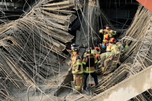 11일 오후 광주 서구 치평동 광주대표도서관 건립공사장에서 발생한 붕괴 사고 현장에서 소방대원들이 철근을 하나하나 끊어가며 매몰자 구조 작업을 벌이고 있다.연합뉴스 제공 |