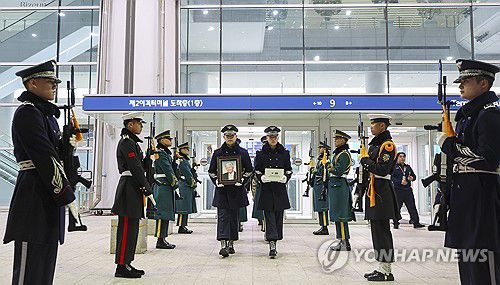 (서울=연합뉴스) 11일 인천국제공항 제2터미널 입국장에서 6.25전쟁 태국 유엔참전용사 고 마놋 품마니컨씨와 나롱 깨 얌니욤씨의 유해봉환식이 진행되고 있다. 2025.12.11 [국가보훈부 제공. 재판매 및 DB금지]