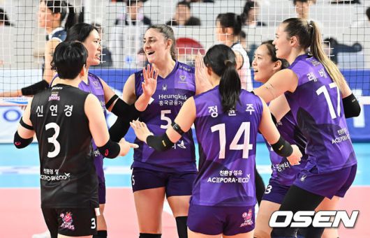 [OSEN=김천, 이석우 기자] 11일 김천실내체육관에서 진에어 2025-2026 V리그 여자부 한국도로공사와 흥국생명의 경기가 열렸다. 직전 맞대결에서 흥국생명에 11연승을 끊긴 한국도로공사가 이번에는 어떤 경기를 펼칠지 주목된다. 흥국생명 선수들이 4세트를 승리한 후 기뻐하고 있다. 2025.12.11 / foto0307@osen.co.kr