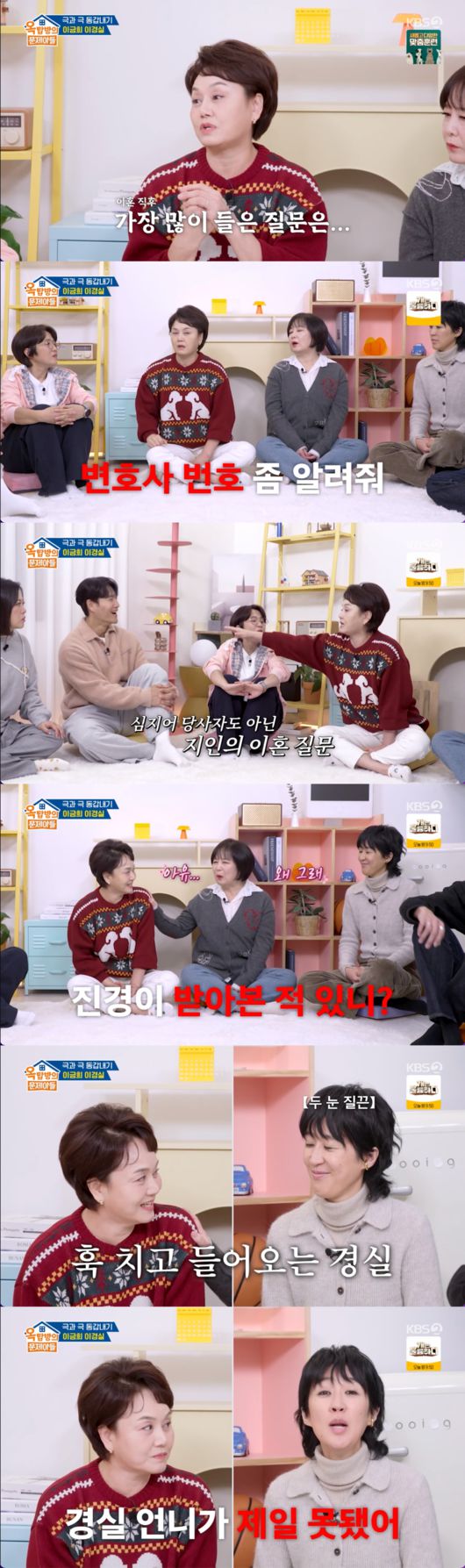 특히 이경실은 이혼 후 가장 당황스러웠던 질문으로 "너 이혼할 때 해결해준 변호사 번호 좀 알려달라고"라는 요청을 꼽았다. 이경실은 "가까운 지인이 물어보더라. 심지어 당사자도 아닌 지인이 물어보라고 했다더라"라고 설명하며 '이혼 전문가'로 오해받는 상황에 쓴웃음을 지었다.