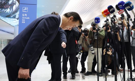 고개 숙인 田 전재수 해양수산부 장관이 11일 오전 인천국제공항 제2여객터미널을 통해 귀국한 뒤 통일교로부터 금품을 수수했다는 의혹에 대한 입장을 밝히며 인사하고 있다. 전 장관은 사의를 표명했고 이재명 대통령은 이를 곧바로 수용, 면직안을 재가했다. 인천공항=뉴시스 |