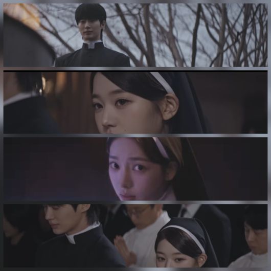 이어 영상은 장원영과 카리나를 차례로 비춘다. 장원영은 수녀복에 차분한 조명을 받아 맑고 담백한 얼굴선을 극대화했고, 카메라를 바라보는 눈빛만으로도 서사의 단서를 던지는 듯한 분위기를 만들었다. 카리나는 더 깊은 감정선을 담은 눈물 연기로, 장면 전체의 톤을 단숨에 ‘영화의 한 컷’으로 끌어올렸다.