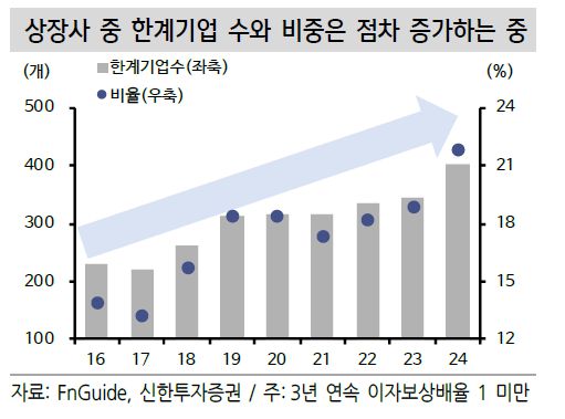 12일 신한투자증권은 '한계기업 현황과 상장폐지 제도 개선' 보고서를 통해 이같이 진단했다. 한계기업 문제가 기업 경쟁력 저하와 더불어 완화적 통화정책이나 지원 정책 등이 복합적으로 작용한 구조적 문제라는 분석이다.