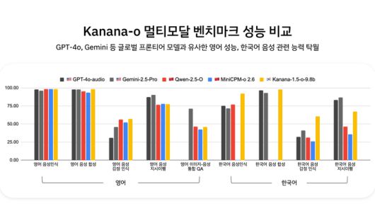 벤치마크 평가 결과 카나나-o는 영어 음성 성능에서 GPT-4o와 유사했고, 한국어 음성 인식 및 합성, 감정 인식 능력에서는 월등히 높은 수준을 기록했다.
