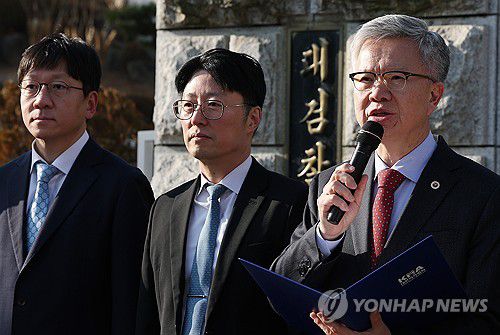 (서울=연합뉴스) 김성민 기자 = 12일 서울 서초구 대검찰청 앞에서 열린 '의대증원 절차 감사원 감사 결과에 따른 전 대통령 등 형사 고발 기자회견'에서 김택우 대한의사협회 회장(오른쪽)이 발언하고 있다. 2025.12.12
