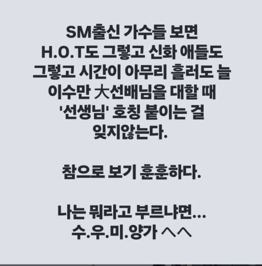송백경은 지난 11일과 12일에 걸쳐 자신의 인스타그램을 통해 복수의 글을 게재했다. 그는 "SM 출신 가수들은 시간이 흘러도 이수만 대선배에게 '선생님' 호칭을 잊지 않는다"며 "참 보기 훈훈하다. 나는 뭐라고 부르냐면 '수·우·미·양가"라고 적었다. 이수만과 양현석을 비교하며, 우회적으로 비판의 날을 세운 것이다.
