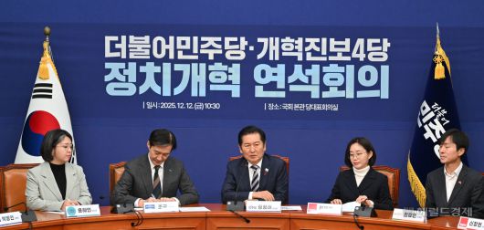 [헤럴드경제=임세준 기자] 정청래 더불어민주당 대표가 12일 오전 서울 여의도 국회에서 열린 더불어민주당-개혁진보4당 정치개혁 연석회의에서 발언을 하고 있다. 왼쪽부터 용혜인 기본소득당 대표, 조국 조국혁신당 대표, 정 대표, 김재연 진보당 대표, 한창민 사회민주당 대표.