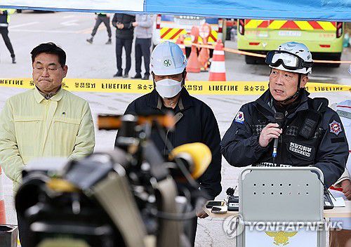 (광주=연합뉴스) 조남수 기자 = 광주대표도서관 신축 공사장 붕괴 사고 이틀째인 12일 광주 서구 치평동 현장 앞에서 안균재 서부소방서 예방안전과장이 기자들에게 브리핑하고 있다. 2025.12.12