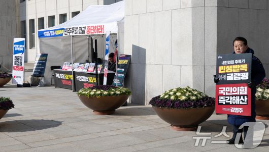 (서울=뉴스1) 이승배 기자 = 김병주 더불어민주당 의원이 12일 서울 여의도 국회 본청 앞에서 내란청산 및 국민의힘 해산 촉구 1인 시위를 하고 있다. 2025.12.12/뉴스1